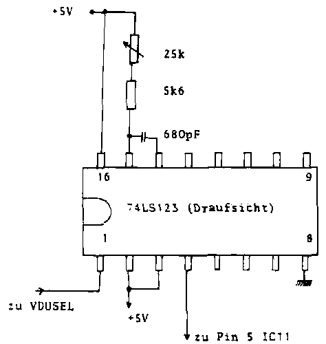 Man löst das Problem, indem man die VDUSEL-Dunkeltastzeit verlängert. Dazu wird ein Monoflop 74LS123 verwendet.