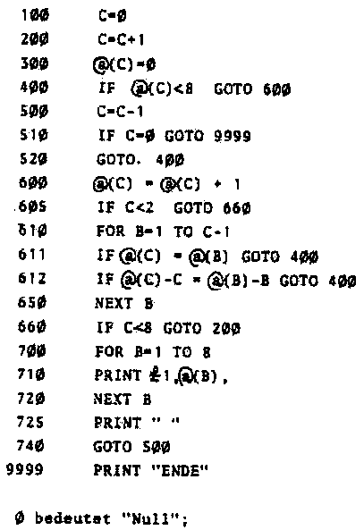 Man kann nun mit Nascom TINY BASIC ein ganz einfaches Programm schreiben, das dieses Problem löst. Ich erkläre das Programm nicht, sondern ich möchte Sie bitten, sich selbst zu überlegen, wie der Algorithmus funktioniert. Klar ist soviel: Wir können damit anfangen, daß jede Dame in einer anderen Spalte stehen muß. Außerdem muß jede Dame in einer anderen Reihe stehen. Der Algorithmus, nach dem dies abgeprüft wird und nach dem abgeprüft wird, ob sich die Damen nicht über eine Diagonale schlagen können, ist vergleichsweise einfach.