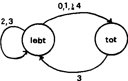 Dieses Spiel wurde im Jahre 1967 von John Conway entwickelt und erfreut sich gerade unter Computeranwendern großer Beliebtheit. Hier dem Spiel steht der Gedanke, Geburt, Leben und Vergehen in einem biologischen Organismus zu simulieren. Dazu gibt Conway (siehe: M.Gardner in „Scientific American“ 223, oct.120-123(1970) und ebd. 224, feb.112-117 (1971)) einen Satz einfacher Regeln an, die sich auch in einem Diagramm darstellen lassen: