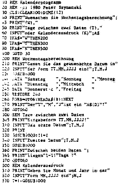 Nun noch einige Erläuterungen zum Listing: Die Zeilen 10 bis 100 enthalten die Initialisierung und die Auswahl der Berechnung. Ab Zeile 200 wird die Wochentagsberechnung durchgeführt, die Berechnung der Tage zwischen zwei Daten steht ab Zeile 300, der etwas kompliziertere Kalenderausdruck erfolgt mit den Zeilen 500 bis 820. Das Unterprogramm ab Zeile 1000 berechnet für ein gegebenes Datum die Anzahl der Tage ab dem Tag 1 des Gregorianischen Kalenders, der allerdings in einer Zeit lag, als der Gregorianische Kalender noch lange nicht in Gebrauch war.