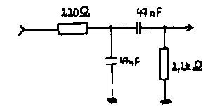 Um das Cassetteninterface des Nascom 1 zu verbessern, leistet das oben abgebildete Doppel-T-Filter gute Dienste. Es wird einfach vor den Cas. in Eingang geschaltet.