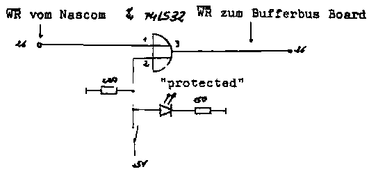 Die untenstehende kleine Schaltung blockiert das WR-Signal für alle Speichererweiterungen. Somit besteht die Möglichkeit, das Programm in einen geschützten Bereich zu kopieren und es nach eventuellen Softwarefehlern trotzdem weiter zu benutzen. Zu beachten ist nur, daß der Stack-Pointer am Programmanfang auf einen nicht geschützten Speicherbereich gesetzt werden muß. Der Refresh-Zyklus der dynamischen RAMs wird nicht beeinflußt.