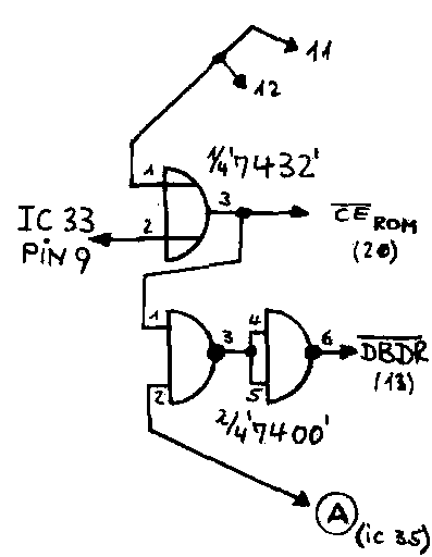 Gebraucht werden je ein 7400, 7432 und ein 24p DIL-Sockel; von beiden ICs werden alle Ansclüsse ausser 7 und 14 waagerecht gebogen und gekürzt. Sodann kann man sie auf eine IC löten, die schon auf einer Platine liegt, am besten ein 7402, 7406 o. ä. mit gleicher Spannungsversorgung auf 7/14. Die DBDR-Leitung von Punkt 13 des Karten-Sockels wird unterbrochen, ebenso wird der Anscluss vom Kartensockel mit der 7400, pin 6 verbunden, der nun offene Anschluss an pin 2 ( mit "A" bezeichnet). Pin 3,4,5 werden zusammengeschaltet. Vom 24p-Sockel werden die Anschlüsse 18,19,20,21 hochgebogen und so verdrahtet: