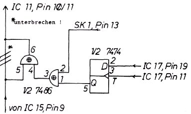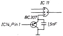 Zunächst zieht man IC 11 aus der Fassung, biegt Pin 5 so um, daß er waagerecht vom IC absteht und lötet einen PNP-Transistor (z.B. BC 307) mit dem Emitter an Pin 5 und Kollektor an Pin 7, dort wo er abgebogen ist. Nun wird ein 1,5 nF Kondensator parallel dazu gelötet (also auch an die Pins 5 und 7). Man sollte schnell löten, damit der IC nicht zerstört wird. Die Basis des Transistors verbindet man mit einem Draht mit IC 14, Pin 1. Greift nun die CPU auf das Video-RAM zu, so wird der Kondensator durch den Transistor entladen, und es gelangen keine Bildinformationen auf den Bildschirm. Erst wenn sich der Kondensator durch einen in IC 11 befindlichen Widerstand "langsam" (ca. 30 microsec.) wieder aufgeladen hat, gelangen neue Informationen zum Bildschirm. Dann ist jedoch der Zugriff auf das RAM längst vorbei, und es entstehen keine Störungen mehr.
