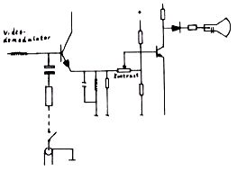 Für Ungeübte kann es ein Problem sein, den richtigen Transistor im Schaltbild und auf der Platine zu finden. Im Schaltbild findet man die Videostufe, indem man von der Kathode der Bildröhre zurück über die Koppelbauteile, meist ein Widerstand und eine Diode, an den Kollektor des Videostufentransistors kommt. Das Steuersignal für die Videoendstufe liefert der erste Videoverstärker. Mit Bauteilbezeichnung und Lageplan ist es dann nicht mehr schwierig, den Punkt zur Einspeisung zu finden. Die vereinfachte Schaltskizze verdeutlicht den Eingriff.