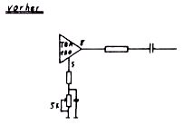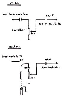 Um eine vollständige Textzeile auf den Schirm zu bekommen, muß in manchen Fällen die Bildbreite reduziert werden. Gibt es keinen speziellen Bildbreitenregler, kann man durch Verringerung der Betriebsspannung gute Erfolge erzielen. Im Netzteil gibt es einen Regler für den Arbeitspunkt der stab. Stromversorgung. Mit wenig Aufwand läßt sich auch das Tonteil umrüsten. Einmal kann man dabei vom Lautstärkeregler ausgehen, wie die folgende Skizze zeigt.