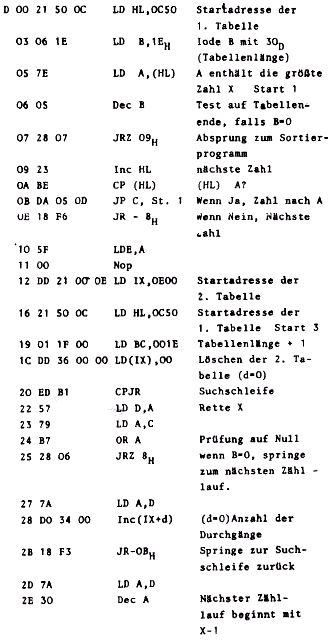 Dieses Programm ist mehr als Grundmuster zu betrachten. Je nach Verwendungszweck kann es umgebaut und erweitert werden. So läßt sich das Auszählen von Zahlen mit 00 dadurch umgehen, daß man eine Schleife mit einem Test auf Null anhängt, welche in einem derartigen Falle die Niederlegung in der Tabelle 2 überspringt und von X max im Register D 1 subtrahiert. Zum Ausdrucken der Histogramme ließe sich z.B. das Druckerprogramm aus dem Programming Manual Seite 64 nehmen und anstelle der Warteschleife einsetzen.