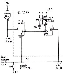 Meine Schaltung aus einem 74121 und einem 74LS74 – ein Flipflop bleibt frei – erfüllt die drei Bedingungen. Es werden invertierte M1-Signale benötigt, die man hinter IC 32a abgreifen kann. In der Nahe ist auch eine Stelle auf der Leiterplatte (hinter SK1), wo sich die zur CPU führende Reset-Bahn sehr schön unterbrechen läßt.