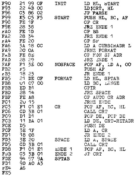 Das Programm ist als Hilfe bei der Eingabe langer Programme in Maschinensprache gedacht.(Wurde nur mit T4 getestet.) Es wird mit E F90 gestartet. Anschließend kann normal M aufgerufen werden. Nach jedem Byte wird ein SPACE gesetzt, nach dem achten Byte ein NL. Das Formatierprogramm nach beendeter Eingabe mit Reset verlassen, da es bei anderen Befehlen stören würde!! Zur eventuellen Veränderung der Adresslage sind die Adressen in F91/F92 und in FB6/FB7 entsprechend anzupassen.