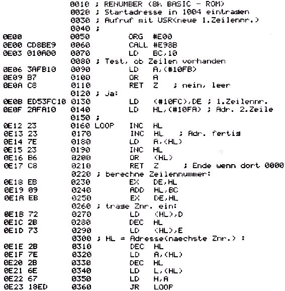 Das folgende Programm ändert die Zeilennummerierung eines BASIC-Programms. Es ist voll verschiebbar, kann also irgendwo im Speicher stehen.