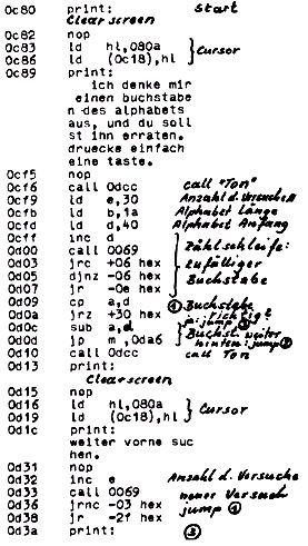 Mit obigem Programm „denkt“ sich Nascom einen Buchstaben und lässt ihn vom Benutzer erraten.