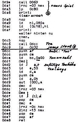Gestartet wird das Programm bei C80. Es enthält bei DCC ein Unterprogramm, das zufällige Tonfolgen nach dem Drücken einer Taste erzeugt. Diese können an Pin 13 von SK 1 abgenommen werden.
