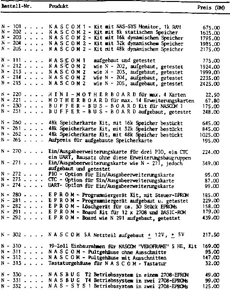 Wir können Ihnen keine pauschalen Anrechnungssätze nennen, da jedes Gerät anders aufgebaut ist, andere, z.T. selbstgebaute, Erweiterungen hat mit oder ohne Gehäuse angeboten wird, etc. Die Erfahrung zeigt jedoch, daß für ein aufgebautes Nascom-System, zwischen 3 – 15 Monaten alt mit 2k Betriebssystem noch etwa der Bausatzpreis zu erzielen ist, je nach Zustand – versteht sich.