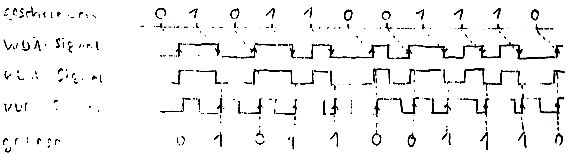 Das Lesen ist wesentlich einfacher als das Schreiben, da die Daten im MDCR bereits dekodiert werden. Bei jeder steigenden Planke des RDC-Signals können die an RDA invertiert anliegenden Daten übernommen werden. Dies kann z.b. dadurch geschehen, daß Bit 0 einen Interrupt anfordert und das Interruptprogramm Bit 1 dann seriell abspeichert. Zur Verdeutlichung die Zeitdiagramme für Schreiben und Lesen: