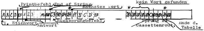 Die Adressen. 0C50 bis einschl. 0C53 dienen als Zwischenspeicher bei der Stichwortsuche. Soll dieser Speicher verschoben werden, müssen die Adressen im Programmteil 042F bis 0441 geändert werden. Soll der Beginn des Stichwort/Antwortspeichers verschoben werden, (im Progr. ist Speicherbeginn 0C54) so sind 0442 und 047F zu ändern.