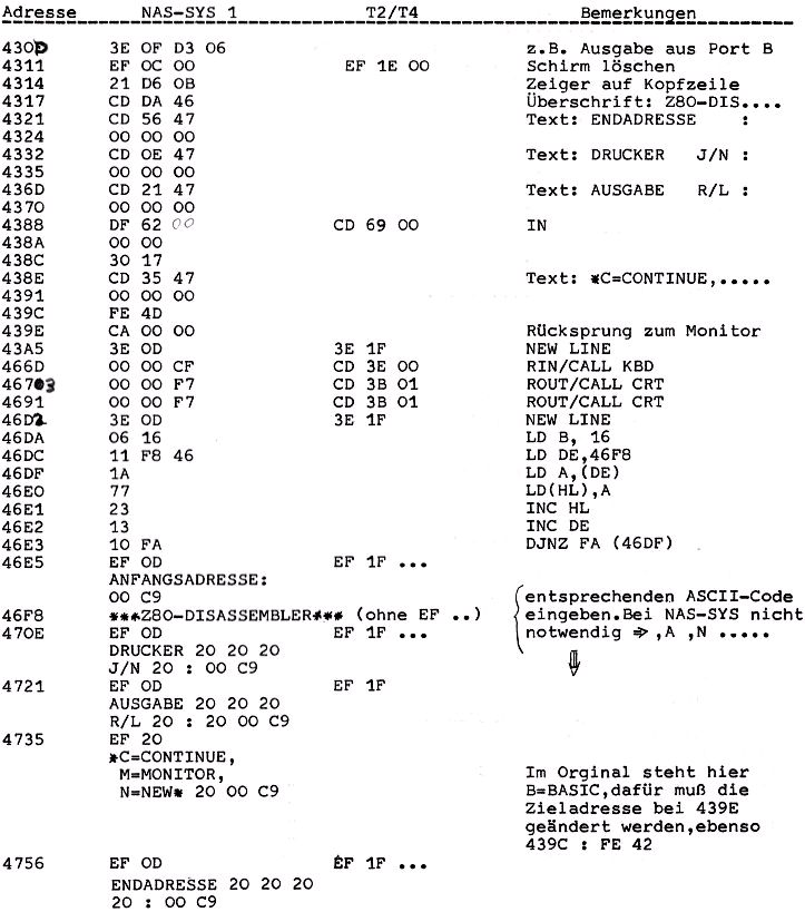 Im Funkschau Sonderheft Nr.33 „Mikrocomputer Anwendungen“ erschien ein Z80-Disassembler für den TRS 80. Er läuft mit folgenden Änderungen auf dem Nascom 1. Unterschiede in den Monitorroutinen werden aufgeführt.