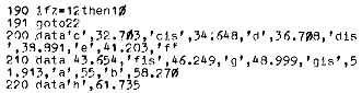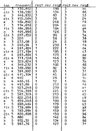 Das folgende Basicprogramm liest die Daten aus Zeile 270 der Reihe nach in die Adressen 0 bis 13. Dabei erzeugt der Soundgenerator einen Dreiklang c-e-g und wiederholt ihn immer wieder mit verklingender Hüllkurve. Experimentieren Sie mit den Tonhöhen, indem Sie die ersten 6 Daten (vielleicht unter Verwendung der Tabelle) verändern.