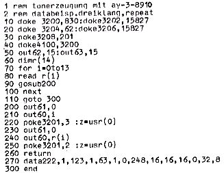 Das gleiche Programm ist im folgenden als reines Maschinenprogramm abgedruckt. (Die Unterprogramme outa bzw. outd mußten im Basicprogramm aus oben erwähnten Gründen „gedoked“ werden.) Wenn Sie hier mit Tonhöhen experimentieren wollen, müssen Sie die Adressen 0CBB bis 0CB6 ( in absteigender Reihenfolge)verändern.