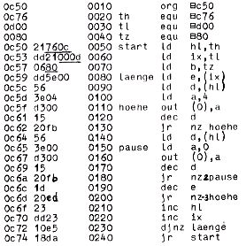 Vielleicht haben Sie schon das Programm „Nascom spielt Melodien“ aus dem Journal 6,7/1980 S. 4 eingetippt und waren über die Geschwindigkeit der Melodie erstaunt? Kein Wunder, das Programm war für 1 MHZ Takt konzipiert! Obwohl die Spielweise unserem hektischen Zeitalter entspricht, haben sich einige Leser daran gestört. Herr Peter Block aus Neckargemünd hat das Problem einfach gelöst, indem er die Tonperioden durch eine zusätzliche Zeitschleife verlängerte. Auf diese Weise muß in der Tonhöhen- bzw. Tonlängentabelle nichts geändert werden, und die Melodie erklingt dennoch gemütlich barock 1 Oktave tiefer und halb so schnell. Zudem ist das Programm nun voll verschiebbar; es existiert kein absoluter Sprung mehr. Zum Abspielen anderer Melodien als in Heft 6,7 beschrieben, sind nur die unterstrichenen Codes zu verändern (Tonhöhentabelle, Tonlängen, Tonanzahl) Hinweise dazu in Heft 6,7/80 Seite 18.