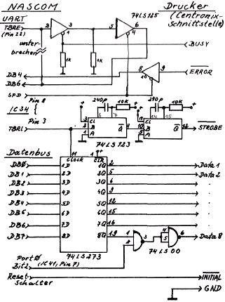 Viele billige Drucker,z.B. der EPSON MX-80 oder der SEIKO GP-80,haben standardmäßig eine Centronix-Schnittstelle und bieten eine Nascom-kompatible serielle Schnittstelle nur gegen Aufpreis (250 Mark). Wer das bezahlt, ist selbst schuld. Man kann natürlich aus beiden Ports der PIO eine Parallelschnittstelle softwaremäßig aufbauen. Dann sind jedoch die leistungsfähigen X-Befehle von T4 oder NAS-SYS nicht ausgenutzt, und man muß die ganze Software mit neuen Druckprogrammen versehen. Ich habe für den Anschluß meines Seiko-Druckers eine andere Lösung gewählt: eine Centronix-Schnittstelle wurde aus 4 TTL-IC’s aufgebaut und parallel zu dem UART geschaltet.