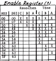 Dabei bedeutet jedes nicht gesetzte Bit die Freigabe für einen bestimmten Klangerzeuger. Die Umrechnerei ist etwas zeitraubend. In der nachfolgenden Tabelle sehen Sie eine Zusammenstellung der verschiedenen Werte. Ein X bedeutet, daß der entsprechende Kanal an den Ausgang gelangt.Will ich nur den Tonkanal A programmieren, so muß in Register 7 62 dez (3E hex) eingespeichert werden.