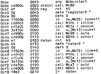Alle oben beschriebenen Register können auch auf einfache Weise in Maschinensprache getestet werden. Dazu laden Sie zunächst das Testprogramm aus dem letzten Heft ab 0C80. Die Adresse 0C97 (Restart Befehl) wird zu C9 (Return) geändert. Jetzt ist das Programm zum Unterprogramm umfunktioniert, welches von nachfolgendem Programm (Start bei 0CBC ) aufgerufen wird.