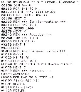 Für das Programm wird eine Hilfsvariable ( H§) gebraucht, die den Wert des jeweiligen Minimums speichert, in A steht die Stelle. Z§ ersetzt die Hand, die die Karte hält, während die Einrückstelle freigemacht wird.