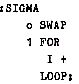 Ein einfaches Beispiel einer Compilierung der Funktion SIGMA (= Summe von 1 bis n) soll den Abschluß dieser Einleitung bilden. Es werden 2 Routinen benutzt: + (vergl. oben TADD!) und SWAP (vertauscht auf dem Stack die beiden oberen Werte). Das „:“ startet die Compilierung, das „;“ beendet sie: