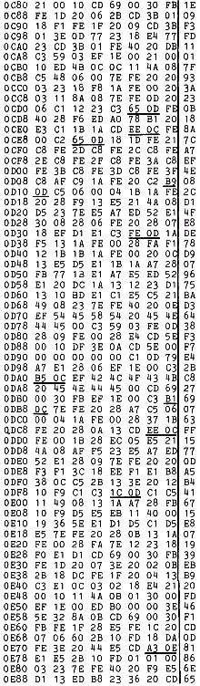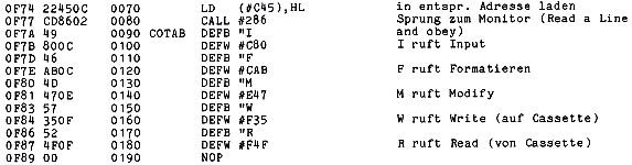 Der Beginn des Textspeichers wird festgelegt in: 0C81, 0CAF, 0E48, 0F36 und 0F50. Die Adresse der Druckroutine ist in folgenden Adressen gespeichert: 0D87 und 0D8E.