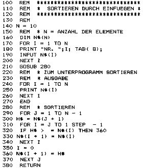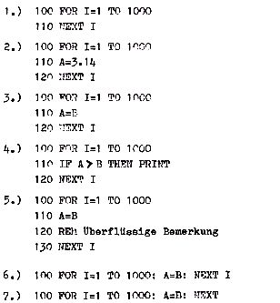 Ein Basic-Interpreter arbeitet ein Programm zeilenweise ab. Dabei wird bei jeder Zeile ein Kontrollmechanismus durchlaufen, der die Zeile auf mögliche Fehler (Syntax, Overflow usw.) untersuchen muß. Außerdem erfordern die einzelnen Operationen natürlich einen unterschiedlich hohen Zeitaufwand. Bei dem „Hauruck“ Sortierverfahren aus dem letzten Journal stellt man fest, daß 3 Arten von Operationen häufig benutzt werden: