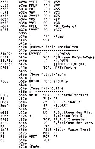 Schon mehrfach habe ich es vermißt, daß das ASCII-Zeichen 07 (BEL) beim Nascom keinen Piepston auslöst. Das wäre praktisch für Terminal-Betrieb oder auch z.B. bei Basic Programmen, um den Benutzer zu einer Eingabe aufzufordern. Das vorgestellte Programm füllt diese Lücke. Einen Verstärker oder Lautsprecher an ein Bit in Port 0 anzuschließen, ist ja nichts Neues und in dieser Zeitschrift schon beschrieben worden. Das Interessante daran ist vielleicht die Methode, durch Umdefinieren der Output-Tabelle und Verwendung der „User“-Funktion diesen Piepser von allen Programmen durch einen Output auf den Bildschirm einschalten zu können; in Basic z.B. durch den Befehl „PRINT CHR (7)“. In der abgedruckten Version erscheint zusätzlich zum Piepston auch das BEL-Symbol auf dem Bildschirm . Das Programm ist relokatibel, kann also an beliebiger Stelle im Speicher stehen. Es muß einmal bei „SUMMER“ gestartet werden. Dann kehrt es zum Monitor zurück und kann sofort durch Drücken der Tasten Crtl-G getestet werden. Es bleibt aktiv, bis die Reset-Taste betätigt wird.