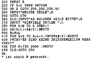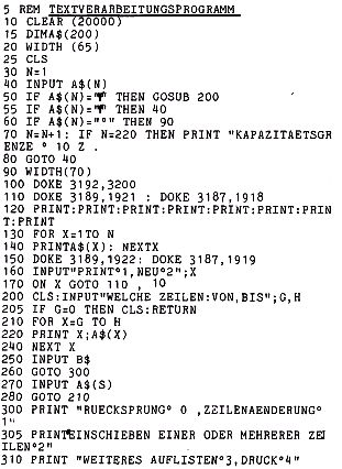 Zeile 10 sollte auf Ihren Speicherumfang zugeschnitten werden. Zeile 15 gibt die max. Zeilenanzahl an. In Zeile 20 wird die Länge der Eingabezeile festgelegt. Die Zeilen 100 und 110 bewirken, daß ein Maschinenprogramm ab C80 bei jedem Printbefehl aufgerufen wird. Dies gilt für Nassys.