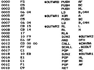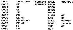 Im Teil 1 wurden Eingabe-Routinen für das Nascom-CLDDOS-System beschrieben. In diesem Teil sollen nun entsprechende Ausgabe-Routinen abgedruckt werden. Die erste Routine konvertiert HEX-Ziffern vom Binaer- ins ASCII-Format. Dann folgen drei Subroutinen für die Ausgabe von HEX-Ziffern, von Bytes und von Worten an das Terminal.