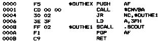 Die Subroutine $Outhex gibt eine Hex-Ziffer an das Terminal aus. Falls im Register A keine Hex-Ziffer enthalten ist, wird ein &Sbquo;?&Lsquo; an das Terminal ausgegeben.