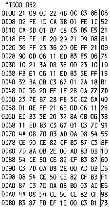 wobei der Tabellenanfang in Reg.HL, die Tabellenlänge in Reg.B und die I/O Adresse des DMA in Reg.C geladen wird. In der Tabelle stehen eine Reihe von Kommandowörtern und Parametern, mit denen der DMA programmiert wird, Nach der Ausgabe des letzten Kommandoworts durch den OTIR-Befehl übernimmt der DMA die Kontrolle über den Bus und verschiebt den Bildschirmspeicher. Nach dem Abarbeiten von „Clear Screen“, „New Line“ oder Ausgabe eines Zeichens zum Bildschirm kehrt das Programm in das Original CRT-Programm zurück und arbeitet wie gewohnt weiter.