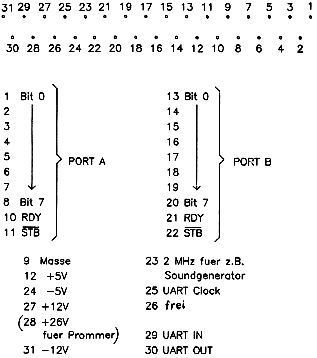 Hier nun endlich die Vorstellung des versprochenen I/O Busses, der es ermöglichen soll, Platinen möglichst problemlos zwischen Nascom Benutzern auszutauschen und an den PIO anzuschließen. Der Anschluß der Bits 0 – 7 und der RDY und STB Signale von Port A und B sind exakt von den PIO Anschlüssen übernommen, ebenso die Ground und +5V Anschlüsse, Dazu kommen die Spannungen +12V und −12V. Die 31-polige Steckverbindung läßt noch Platz für einige weitere Optionen; zum Beispiel die Programmierspannung für Prommer, den Takt für den Soundgenerator und 3 Anschlüsse für den UART (Clock, IN, OUT). Ein Anschluß könnte möglicherweise den 4MHz Takt für ein Interface für den MDCR führen.