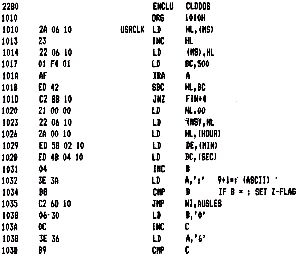 Der 2 ms-Interrupt des CLD-DOS-Betriebssystems läßt sich umleiten und steht für eigene Anwendungen zur Verfügung. Das Programm benutzt ihn zur Steuerung einer Uhr und zur Abfrage des Ringbufferzählers der Tastatureingabe. Der mit dem dicken Strich versehene Teil (er kann auch weggelassen werden) erzeugt nach der Übernahme eines Zeichens in den Ringbuffer einen Knackton am Lautsprecher. Das erhöht meiner Meinung nach die Eingabesicherheit ganz erheblich, da die Nascom-Tastatur keinen exakten Druckpunkt hat. Der mit dem Doppelstrich markierte Teil des Programms überprüft, ob die eingegebene Uhrzeit sinnvoll ist; er kann ebenfalls weggelassen werden. Die Uhr läuft übrigens bei häufigem Zugriff auf die Diskette nicht sehr genau, da bei Schreib/Lesevorgängen der Interrupt ignoriert wird. Die Erhöhung der Rechenzeit bei laufender Uhr ist unerheblich. (Ich konnte keine feststellen). Das Programm belegt bei mir den vom System nicht erfaßten RAM-Bereich von 1000H bis zum Beginn des „geschützten RAMs“ bei 1400H.