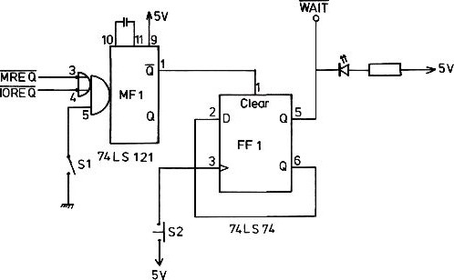 Aber auch größere Sprünge, nämlich bis zum nächsten I/O-Befehl, die ebenfalls im Monitorprogramm vorkommen, sind möglich. Dafür wird einfach die MREQ-Leitung zur Zusatzschaltung unterbrochen und ein WAIT-Signal kann folglich erst beim nächsten IORQ erzeugt werden.