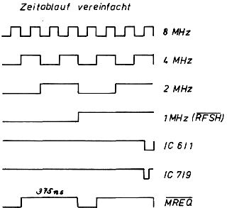 Durch das VBLANK-Signal wird der Bus vom Prozessor angefordert. Wenn der Prozessor den Bus mit BUSAK freigibt, werden die Zeilen und Spaltenzähler des Videoteils auch als Adresszähler verwendet. Dadurch werden mit Hilfe des RD- und MREQ-Signals die Graphik-Bytes auf den Datenbus gelesen. Mit dem Schieberegister (IC 6) wird daraus das Bildsignal erzeugt. Diese wird mit dem Bild- und Synchronisationssignal vom Videoteil gemischt und kann so direkt in meinen Fernseher eingespeist werden. Damit sich die Inhalte der dynamischen RAMs nicht verändern, wird bei jeder Adresse noch ein Refresh-Lesen durchgeführt. Außerdem wird das Ein- und Ausschalten durch zwei Flip-Flops gesteuert. (74LS74 hat bei mir nicht funktioniert) .