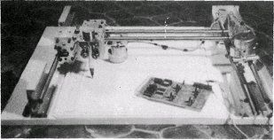 Zunächst wollte ich den Plotter in eigener Regie herstellen, habe aber bald gemerkt, daß eine Unmenge an feinmechanischem Werkzeug nötig wäre, bis mir der Katalog der Firma Isert-Electronic in die Hände fiel. (__________., ____ Eiterfeld _) Dort wurde genau das angeboten, was ich brauchte. Inzwischen wurden die Produkte der Firma vervollkommnet, und man kann einen vollständigen Bohr-und Fräsautomaten für DM 1480.– bekommen, der sich natürlich auch als Plotter einsetzen läßt. Schon dieser Preis für eine fertige Anlage läßt sich kaum mit den Preisen für handelsübliche Plotter vergleichen. Eine Schablonenvorrichtung und Motoren für die Fräse und Bewegung in Z-Richtung brauche ich aber nicht, und so läßt sich der Preis wiederum reduzieren.