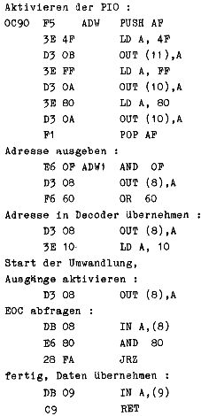 Zur Ansteuerung des A/D-Wandlers in BASIC (8K-ROM-Version) benötigt man noch folgendes Unterprogramm :