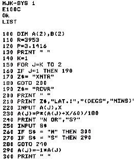 Das BEAR-Programm habe ich für den Nascom eingetippt – es geht. Einzugeben sind die Koordinaten für den Empfängerstandort (RCVR) und einen Senderstandort (XMTR). Die Beispiele zeigen Frankfurt und Lopik bzw. Quito/Ecuador.