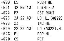 Und hier vielleicht noch eine kleine Programmidee für diejenigen unter uns, die noch keinen Disassembler ihr Eigen nennen können. Der von Herrn Deege umgeschriebene Disassembler läuft nicht schlecht, und so habe ich ihn dazu benutzt, um bei der Erstellung dieser Cassette einiges an Zeit einzusparen. Die Listings der Programme CONMOD und GKSU wurden vom Disassembler direkt in den Textspeicher des Formatierprogramms geschrieben und konnten danach an das NAS-SYS Format mühelos angepaßt werden. Anstelle des Aufrufs von ROUT (RST 30) wurde der Unterprogrammaufruf CD 20 40 eingeschrieben. Das Programm sieht dann so aus: