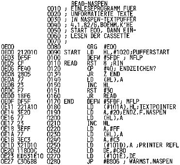 Das folgende kleine Programm soll es ermöglichen, unformatierte Texte in den Textspeicher von NASPEN VS.1 einzulesen. Unter unformatiert verstehe ich einfach eine Reihe von ASCII Zeichen ohne Angabe von Speicherbereich oder besondere Kontrollzeichen. Solche Texte können z.B. durch das Formatierprogramm (Heft 8-81) oder das Lesen vom Bildschirm (Heft 11/12-81) generiert werden. Zunächst macht man einen Kaltstart von NASPEN bei B800. Dann wird das Einleseprogramm bei E00 gestartet. Die grüne Drive-LED leuchtet auf als Zeichen, daß der Text eingelesen werden kann. ( Wer den Cassettenrecorder automatisch ansteuert, muß eben rechtzeitig die Textcassette einlegen. Der Text wird während des Lesens auf dem Bildschirm ausgegeben. Nach Textende (@ muß als einziges Kontrollzeichen auf derCassette sein.) verlischt die LED, und das Programm macht automatisch einen Warmstart von NASPEN. Falls sich am Textbeginn vom Start des Einlesens noch Zufallszeichen befinden sollten oder der Schirm gar dunkel bleibt, kann man durch mehrmaliges Drücken der Space-Taste bis zum richtigen Textanfang vorrücken und die überflüssigen Zeichen mit DELETE „d“ entfernen. Der Text steht nun für weitere Verarbeitung mit NASPEN zur Verfügung. Die Zeilen 250 bis 270 laden die Adresse der Druckerroutine in die entsprechenden Speicherzellen. (Bei mir beginnt sie in #C80) Sie müssen bei Bedarf verändert oder weggelassen werden.