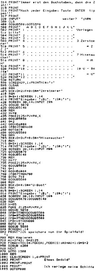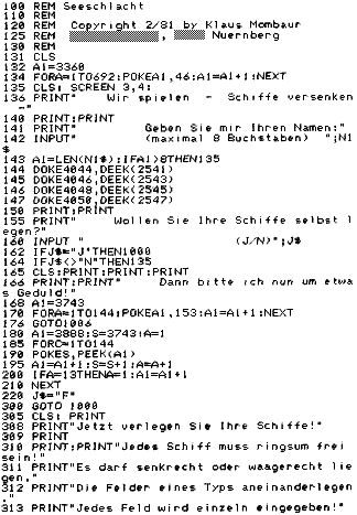 In der folgenden Seeschlacht hat jeder abwechselnd einen Schuß auf das gegnerische Feld. Nach einem Treffer darf weitergeschossen werden, bis nichts mehr getroffen wird. Man braucht weder Papier noch Bleistift; alles wird vom Computer registriert und angezeigt. Das Programm erklärt sich weitgehend von selbst. Es benötigt 16 K RAM (C80 4FFF) und läuft mit Nassys.