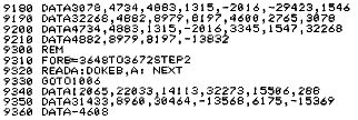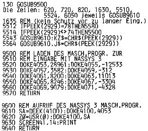 Mit folgender Änderung wird das Programm auch für Nassys 3 lauffähig. Es wird zur Eingabe ein Maschinenprogramm benutzt, das die eingetippten Werte direkt in die Adressen lädt, die der Rechner erwartet. Ich hätte das Laden des Maschinenprogramms gerne mit READ und DATA etwas eleganter gestaltet, aber Herr Mombaur hat da eine Routine eingebaut (Zeile 9310), die eine Manipulation mit dem Programm verhindern soll und deren Aufruf ich im Programm nicht finden konnte. So werden die Opcodes einfach mit DOKE geladen. Etwas umständlich, aber es funktioniert. Das Maschinenprogramm läßt sich nicht komfortabler schreiben (z.B.Cursoranzeige etc.), da es bei einer Vergrößerung in den Stackbereich käme.
