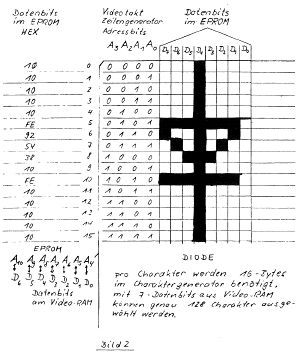 Nach den 14 Eingaben ist das Muster aus dem Bildschirm direkt in den Speicher ab Adresse (K2+Zeichenadresse) übertragen und kann von dort direkt in ein EPROM geschrieben werden.