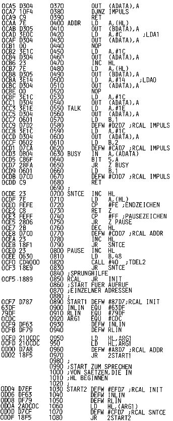 Das Programm TALK4 gibt die Möglichkeit, sämtliche Einsprungadressen in ihrer Verwertbarkeit als Teilwort oder Geräusch zu testen. Die folgende Tabelle gibt die Adressen von möglichen Teilwörtern oder Lauten, die allerdings nicht alle so überzeugend klingen, daß man sie durchweg verwerten könnte. Auf eine Tabelle von Geräuschen habe ich verzichtet, da sich diese erstens schlecht niederschreiben lassen und zweitens eine Wertung der Anwendungseignung haupsächlich eine Geschmacksfrage ist.