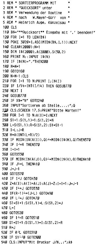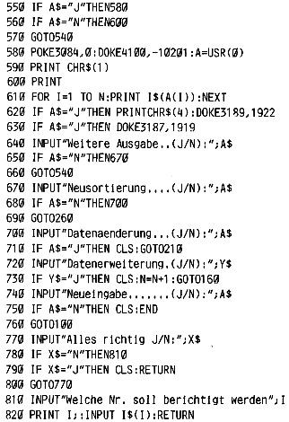 Zeile 580 und 590 schalten den Drucker ein, das hier ein normaler Fernschreiber ist (T100s). Das Druckerprogramm ist das TTY-SYS vom Herrn Ploss und liegt hier auf der Adresse (D800 – DFFFh). Die Aktivierung liegt im Befehl DOKE 4100,-10201. Sollte das TTY – SYS in einem anderen Bereich liegen, so ist die zweite Ziffer in diesem DOKE Befehl dementsprechend zu aendern. In den Zeilen Nr. 620 und 630, das entspricht dem „N“ Befehl, wird der Drucker wieder abgeschaltet.
