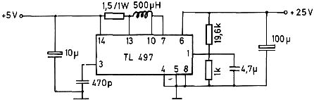 Mit diesem IC und ein paar Beschaltungsbauteilen wird die vorhandene 5V-Spannung auf 25V hochtransformiert. Die Beschaltung dazu zeigt Bild 1.